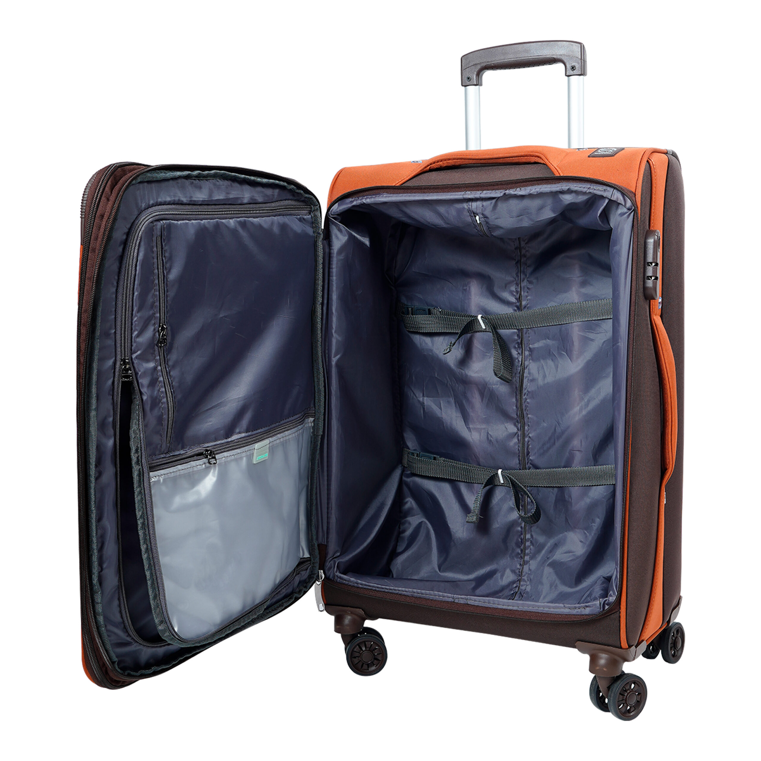 | Material- 600D and Nylon Front Pocket | Wheels- 8 wheel spinner system with 360* Movability